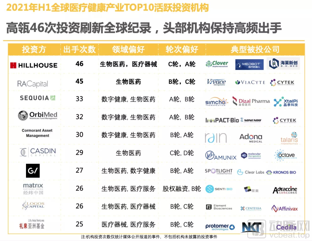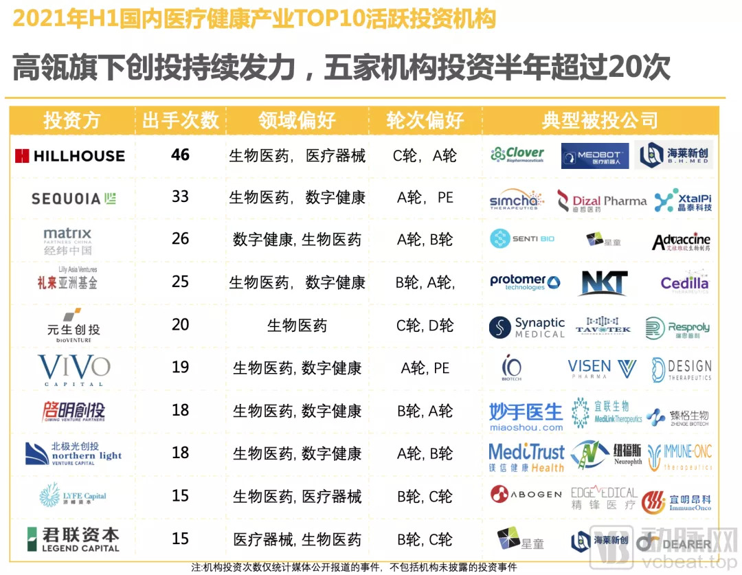 2021年上半年,以高瓴、红杉资本中国基金为首的国内明星机构对国内医疗健康公司的投资更加频繁。