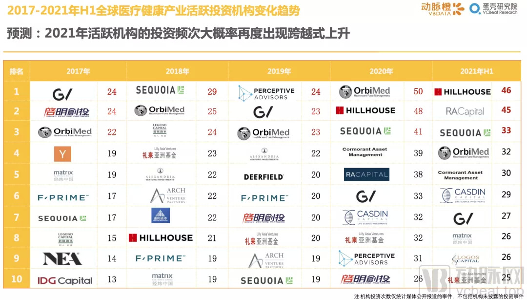 三、 2021年H1医疗健康活跃投资机构分析