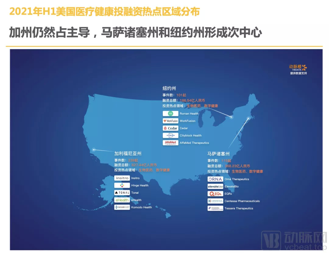 2021年H1,美国加利福尼亚州累计发生239起融资事件,筹集127亿美元(约827.44亿人民币),这也是全球医疗健康风险投资事件交易最为活跃的地区。