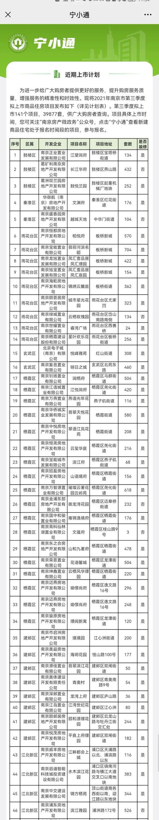 第三季度拟上市141个项目,39877套房源,供广大购房者查询。项目具体上市时间,可关注“南京房产微政务”公众号,点击“宁小通”查看新建商品住宅处于报名时间段的项目,参与报名。