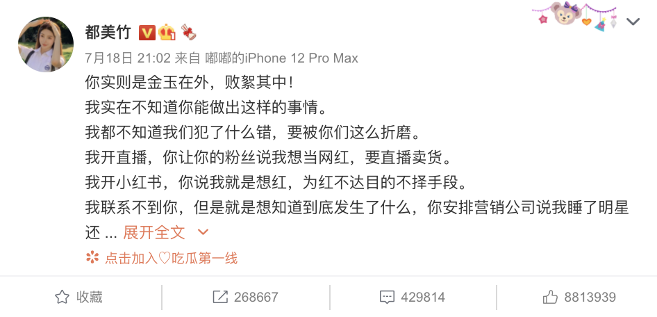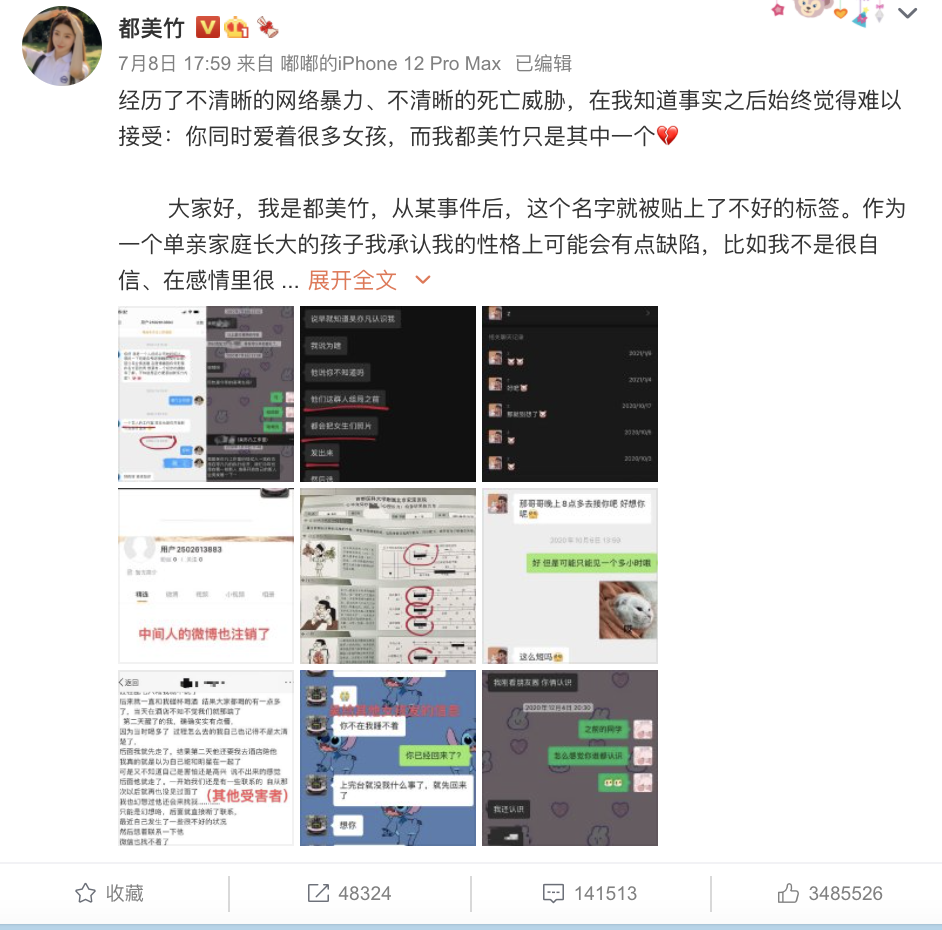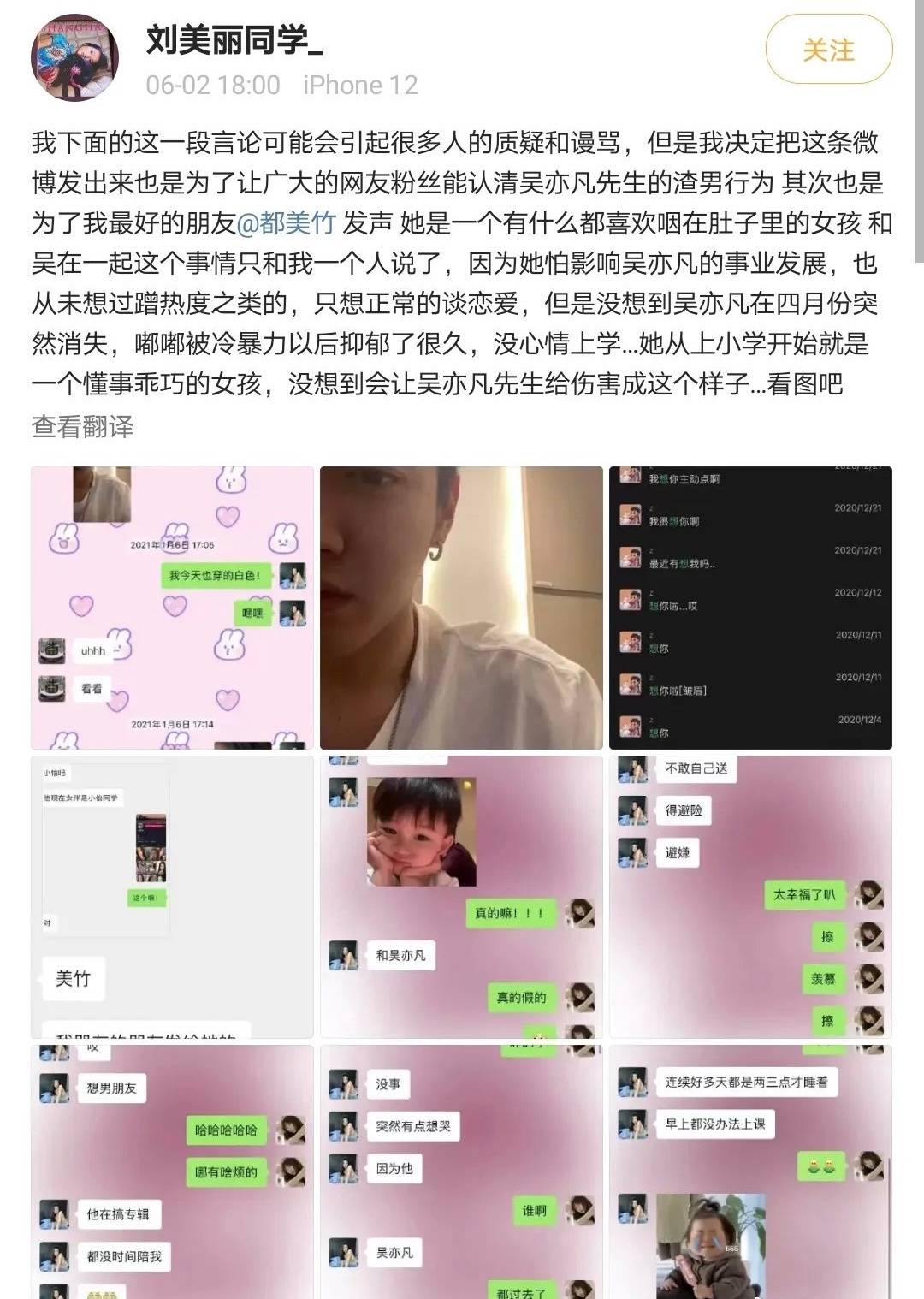 7月8日,都美竹发文称经历了网络暴力和死亡威胁之后决定站出来为所有被欺骗的未成年女孩发声,公开疑与吴亦凡工作室等人的聊天记录截图,曝光吴亦凡以选角为由与多名女性发生不正当关系,其中可能包含未成年人。