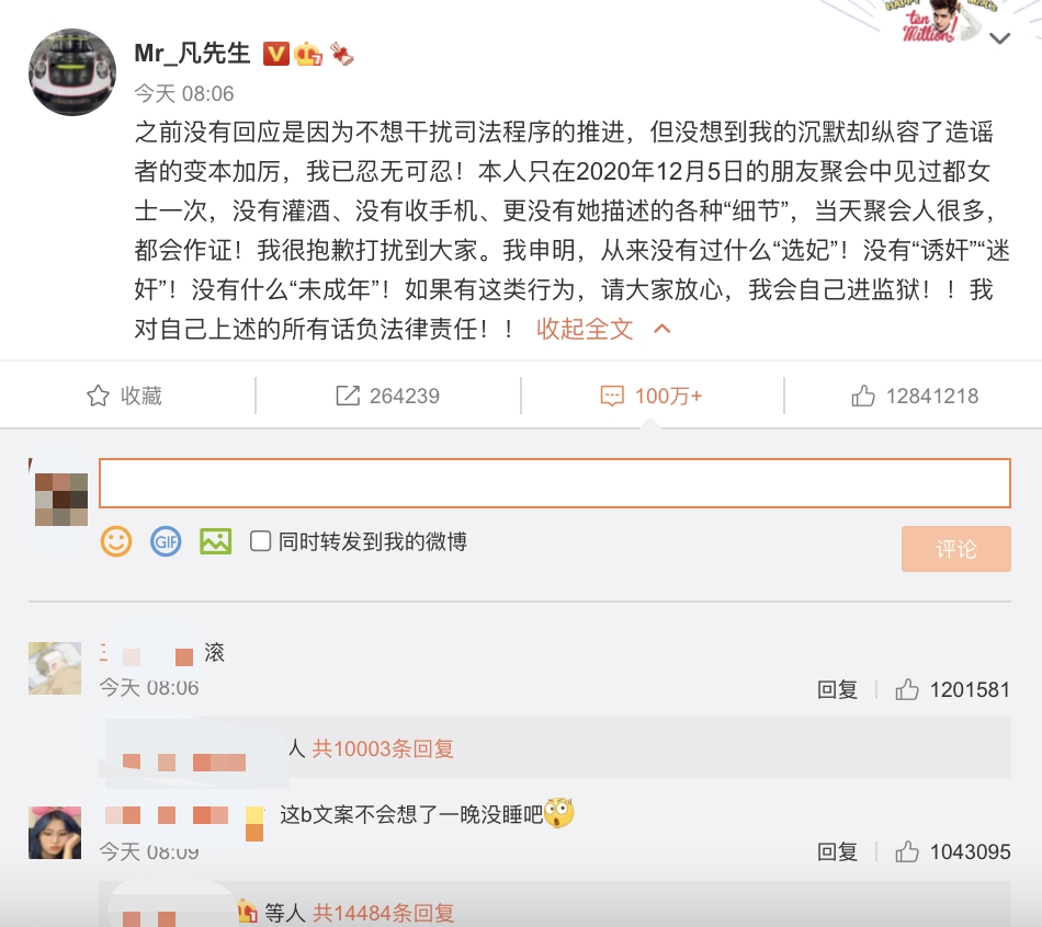 对此,吴亦凡及其工作室在7月19日发布声明,称都美竹发布内容皆为伪造已经报警处理。然而,网友并不买账,火速攻占评论区让吴亦凡“滚出中国”和“退出娱乐圈”等。