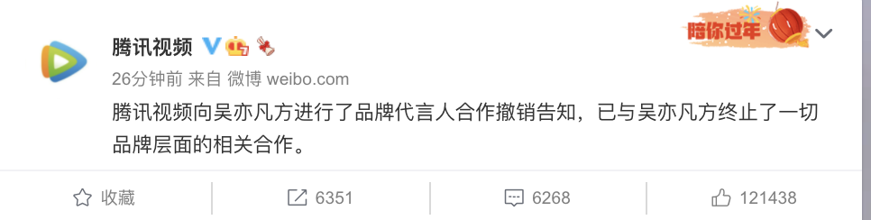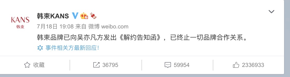 7月19日21点11分,保时捷官方发表声明,宣布即日起终止与吴亦凡的品牌合作关系。在此之前,韩束、云听App、立白、滋源、得宝、华帝、康师傅冰红茶和腾讯视频8家品牌的解约声明,标志着吴亦凡的内地商务合作已全部解约。随后,乐堡啤酒和保时捷也相继宣布解约。截至发稿,已经有10家品牌与吴亦凡解约,仅路易威登、宝格丽、欧莱雅男士3家品牌还未就相关事件表态。其余品牌或在第一时间澄清合约在该事件爆发前已经结束,或将相关合作微博转限。
