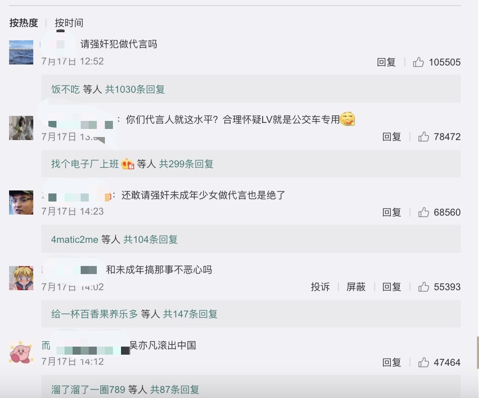 截至发稿,仅路易威登、宝格丽、欧莱雅男士三家品牌还未就相关事件表态。在此事件过程中,尽管多家品牌早已纷纷避嫌将吴亦凡相关微博设置权限,其他博文底下也充斥着网友要求解约的抵制评论,网友纷纷表示如果上述品牌不和吴亦凡解约,将避雷对待。