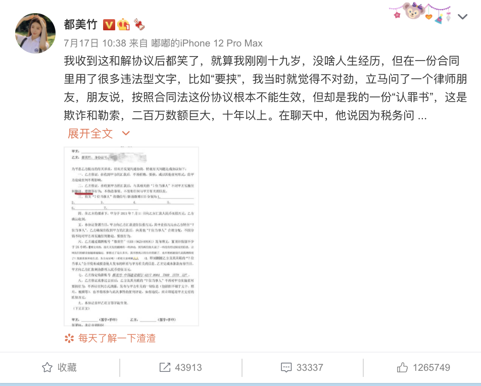然而,十天后风波又起。7月17日开始,都美竹接受媒体采访并在个人微博连续发布多条博文,通过大量的聊天截图、转账记录、和解协议爆料更多细节,直言为了自己和身后大量的受害者将会“堂堂正正地战斗”,要求吴亦凡“站出来吧 像个男人”并道歉退圈。