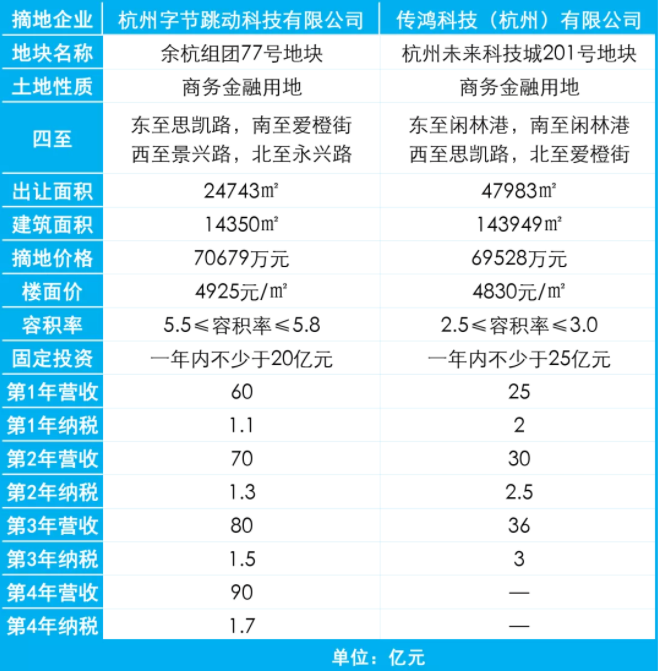 钉钉地块更为舒适,纳税门槛也相对更高,土地交付后,3年累计纳税需达到7.5亿元;字节跳动地块营收门槛更高,实际4年累计纳税5.6亿元,明显低于钉钉地块。