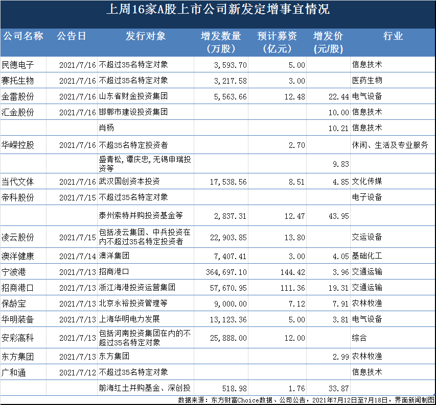 7月12日至7月18日当周,据东方财富Choice数据统计,宁波港(601018.SH)、安彩高科(600207.SH)、凌云股份(600480.SH)、金雷股份(300443.SZ)等16家公司拟发股募资,预计合计募资额约342.62亿元。