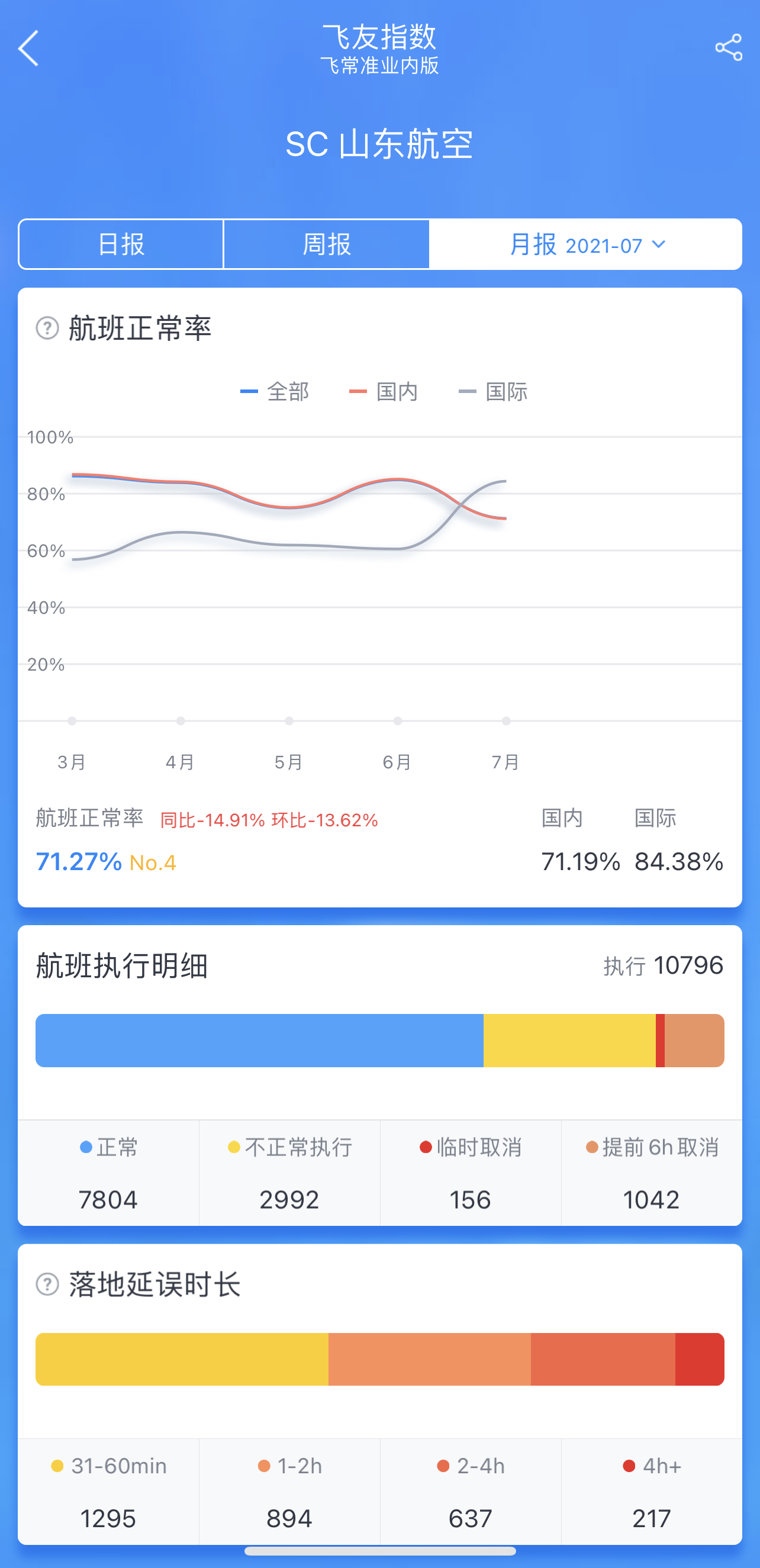 被网上称为“硬核航空公司”的山航,其航班正常率又如何呢?记者查询飞常准数据,过去的4到6月份,山东航空航班正常率分别为83.89%、74.95%、84.89%、在主要航空公司中排名均为前三位;7月以来受雷雨天气影响,山航航班正常率表现较为逊色,为71.27%,排名下降至第四位,同比降低14.91%、环比降低13.62%。