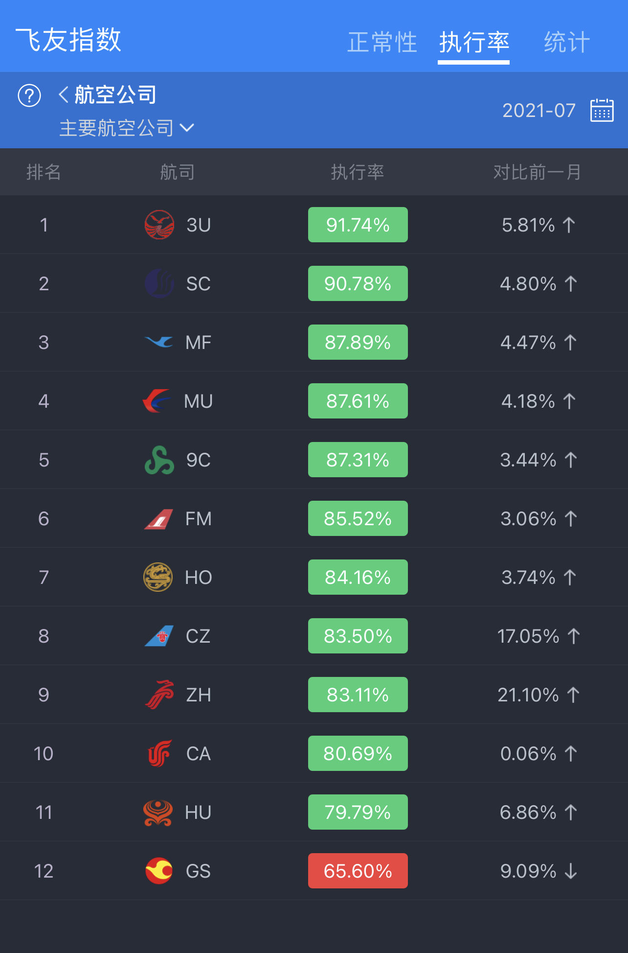 而在航班执行率方面,山东航空也居于前列,4-6月份山航航班执行率分别为94.71%、89.56%和85.98%,7月以来山航航班正常率则为90.78%,仅次于四川航空,排在第二名。