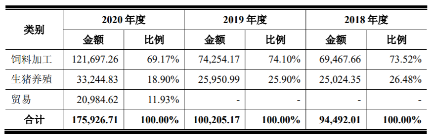 招股书显示,谷实生物主要以饲料加工业务为主,报告期内,饲料销售收入占主营业务收入比重分别为73.52%、74.10%和69.17%,是公司收入的主要来源,此外生猪养殖业务也是公司收入的另一大来源。