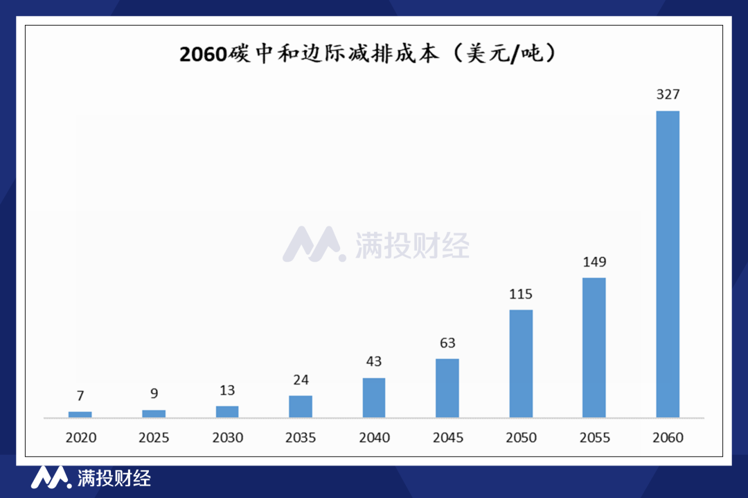 根据清华大学能源环境经济所对碳中和边际减排成本(碳价)做了研究和预测,预计碳价将从2020年7美元/吨,提升至2030年的13美元/吨,2060年碳价将达到327美元/吨。随着碳达峰碳中和进程的推进,配额总量呈现缩紧趋势,从而推动碳价上行。