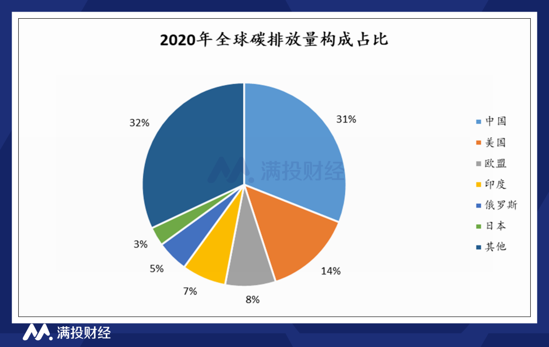 近年来,二氧化碳的排放增速在全球范围内放缓, 2020 年在疫情背景下全球二氧化碳排放量下降至 319.84亿吨,同比下降 6.04%。从2020年全球碳排放构成来看,中国的二氧化碳排放量达到98.94亿吨,占全球 31%,为 2020 年排放量第一大国。中国自 2005 年起碳排放量超过美国成为第一,然而自 1965 年 BP 数据统计的累计碳排放来看,中国的历史累计碳排放量仍明显低于美国。从人均碳排放角度来看,目前中国低于美国、俄罗斯、日本,但已高于欧盟。