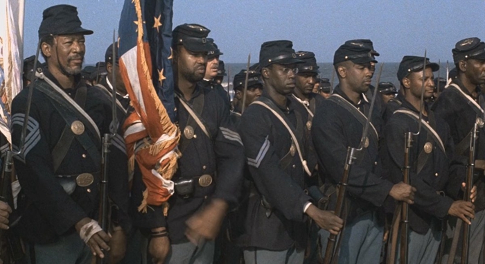 《光荣战役》(Glory)由马修·布罗德里克、丹泽尔·华盛顿、加利·艾尔维斯、摩根·弗里曼主演,讲述了第一支非裔美国人组成的军队——“麻州第五十四兵团”的故事。丹泽尔·华盛顿因其出色的表演获得奥斯卡最佳男配角奖。