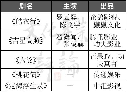 腾讯主控的耽改仙侠剧《皓衣行》与《吉星高照》(原名《天官赐福》)由于书迷以及明星粉丝的数量庞大,被预定为接下来的“爆款热剧”。但其实腾讯出品的剧集并不靠谱,《千古玦尘》《择天记》《遇龙》等豆瓣评分仅3到5分的扑街仙侠剧皆为腾讯主投。腾讯将《天官赐福》改名为《吉星高照》似乎就是在祈祷自家新剧能播、能爆、能“吉星高照”,不用像《皓衣行》一样同款“撕日历”。