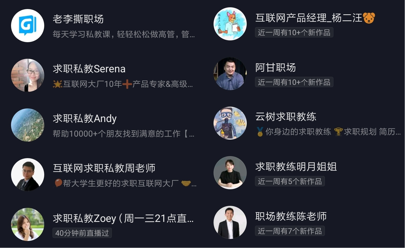 “带小白跨行,让你高薪入职互联网”“大厂offer收割机,手把手带你职场逆袭“。抖音上,一些冠以“职场教练”、“求职私教”等头衔的帐号,正在吸引上万粉丝,借助短视频之风,实现快速的规模扩张。