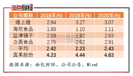 值得关注的是,真美股份对下游ODM客户依赖度较高。2017年至2019年,公司对前五名客户的销售收入占营业收入的比例分别为 59.65%、61.21%和 57.00%。对比盐津铺子、海欣食品等以经销商、商超渠道为主的销售模式,公司营收规模较小,大客户较为集中,而个别客户应收账款余额的增加会导致公司应收账款余额显著增长,进而拉低应收账款周转率。