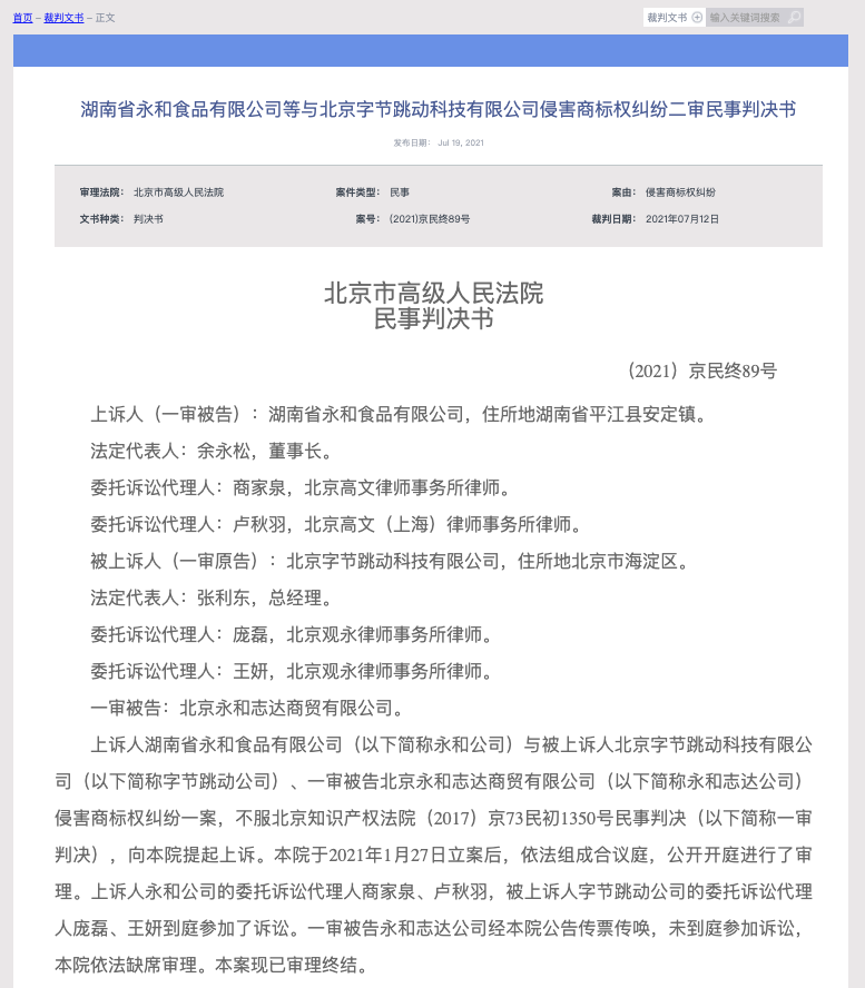 据天眼查APP显示,7月19日,北京法院审判信息网公开湖南省永和食品有限公司等与北京字节跳动科技有限公司侵害商标权纠纷二审民事判决书,案号(2021)京民终89号,审理法院为北京市高级人民法院。本案裁判结果为驳回上诉,维持原判。本判决为终审判决。