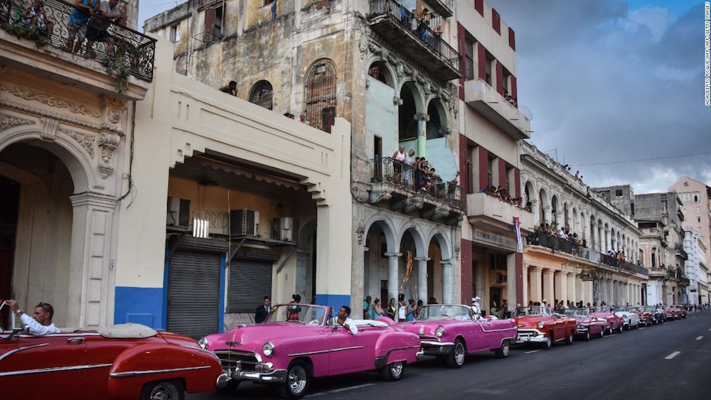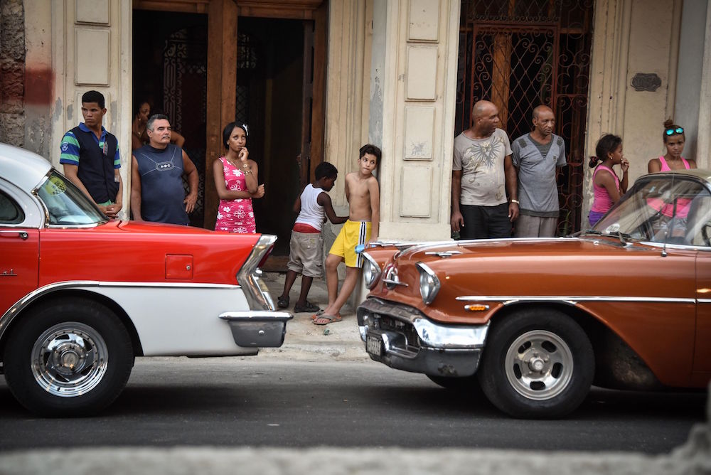 古巴首都哈瓦那的普拉多大道(Paseo Del Prado)两旁,好奇的小孩和大人在围观着一条长长的彩色古董车龙。