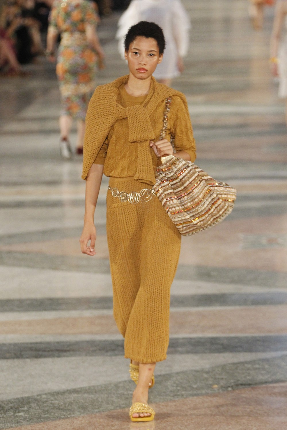 古巴曾是海盗的庇护所,就因为它绿茵掩映,枝繁叶茂,植被覆盖的地区可以找到大量粉红色火烈鸟。而当我们看到这套时装时,不禁好奇这刺绣工艺展现的是什么花。从颜色和形状来看,这些橘红色的花朵很像 Cordia Sebestena,是独属于加勒比海域的植物,盛开在初春的常青树上。粗糙的大叶片并不密集,让这些花朵可以坦露在热带的阳光之中。
