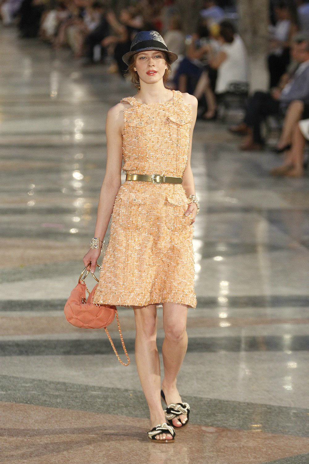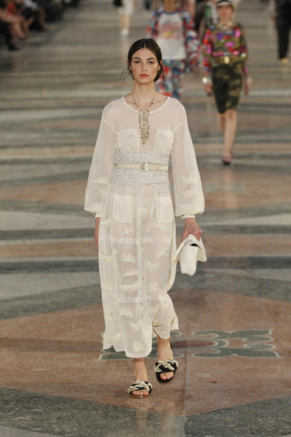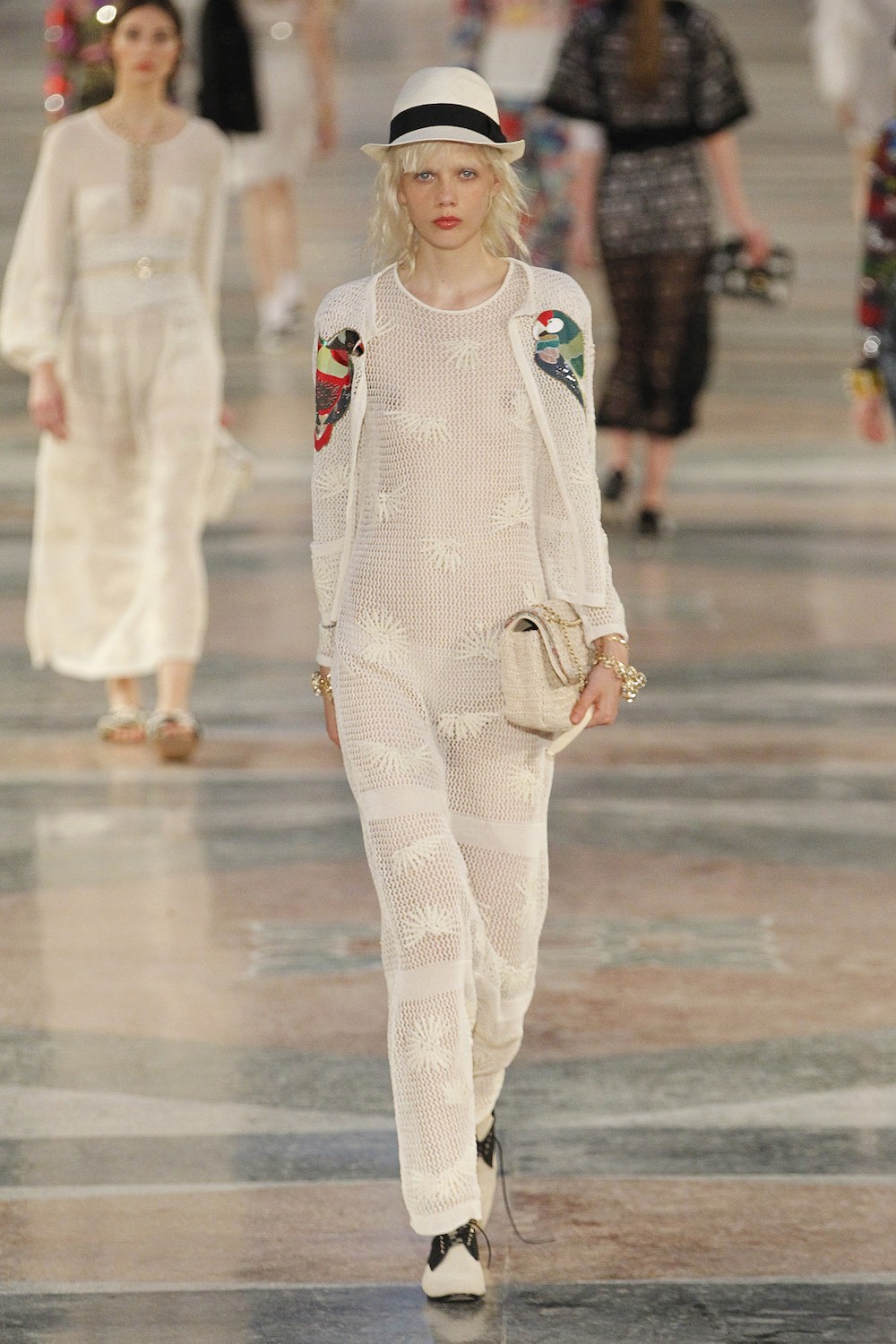而在这次Chanel的度假系列里,不难找到这样的延伸款。褶皱、荷叶边、层次、网纱,这些看起来繁复的元素镶嵌在纯白色裙子上,很有古巴人最爱的西班牙风情。