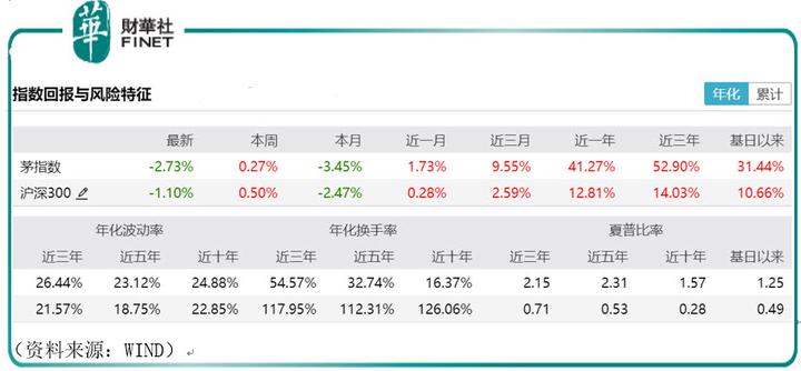 截至目前,WIND茅指数近三年收益率52.9%,而近三年年化波动率为26.44%。与此同时,沪深300近三年收益率14.03%,而近三年年化波动率为21.57%。可以看出,WIND茅指数构建的组合资产,收益率远远大于沪深300,而波动率却近似。这意味着最近三年来,茅指数组合在收益上比沪深300好,而在风险上比沪深300要更稳健。