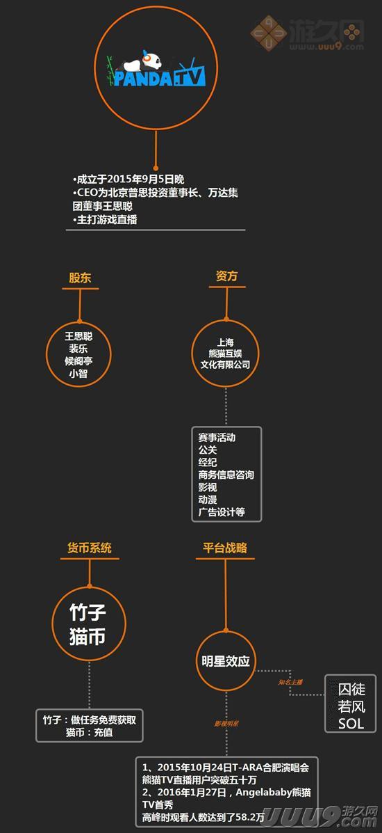 熊猫TV与其他众多平台最大的不同来自于创始人王思聪,王思聪是一个拥有1600万粉丝的网红,有着很高的社交知名度。细数他的涉猎,王思聪旗下有着 IG 游戏战队,IG 包含 Dota2、LOL、FIFA、CF 和 SC2 分部,并获得过 CFS、WPC 等多项国际赛事的冠军;王思聪为万达集团董事、普思投资董事长,先后投资过天鸽互动、云游控股和乐逗游戏等上市公司,背靠万达集团;王思聪成立香蕉计划,承办英雄联盟德玛西亚杯、拿下LPL独家转播权。