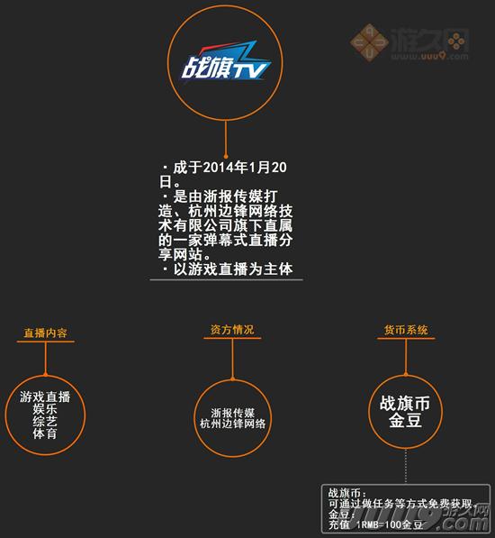 战旗TV成于2014年1月20日。是由浙报传媒、杭州边锋网络技术有限公司旗下直属的一家弹幕式直播分享网站。以游戏直播为主体,涵盖综艺、娱乐、体育等多个直播类目。