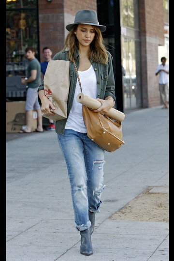 好莱坞甜妞杰西卡奥尔芭一直都很会穿。破洞牛仔裤被她穿出了西部浪子的感觉,包包和帽子简直点睛之笔。