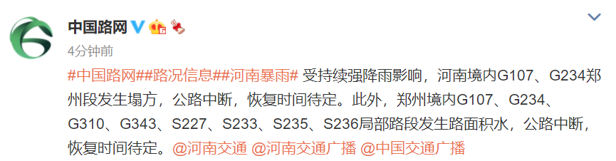 据@中国路网 微博消息,受持续强降雨影响,河南境内G107、G234郑州段发生塌方,公路中断,恢复时间待定。此外,郑州境内G107、G234、G310、G343、S227、S233、S235、S236局部路段发生路面积水,公路中断,恢复时间待定。