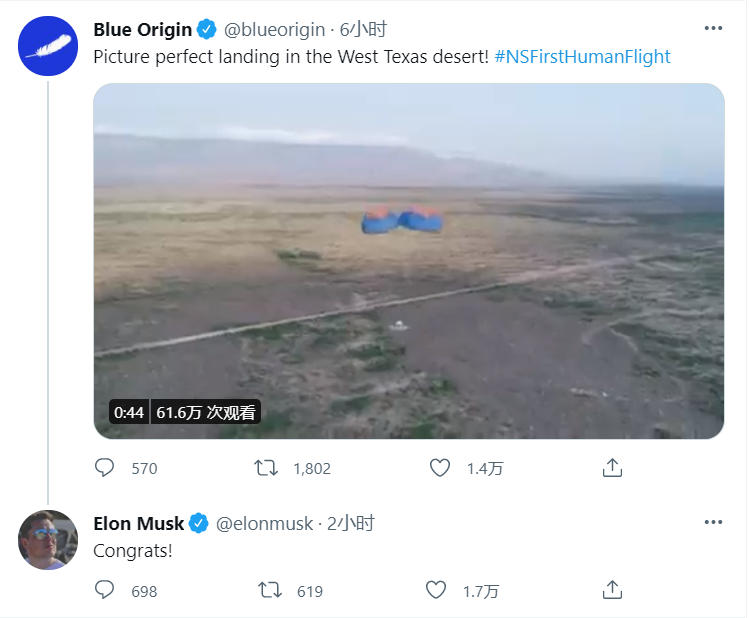 7月21日早间消息,北京时间今日凌晨,蓝色起源在其官方推特上披露全球首富贝索斯等人顺利着陆的视频画面,特斯拉首席执行官埃隆·马斯克转发该视频并配文“恭喜!”