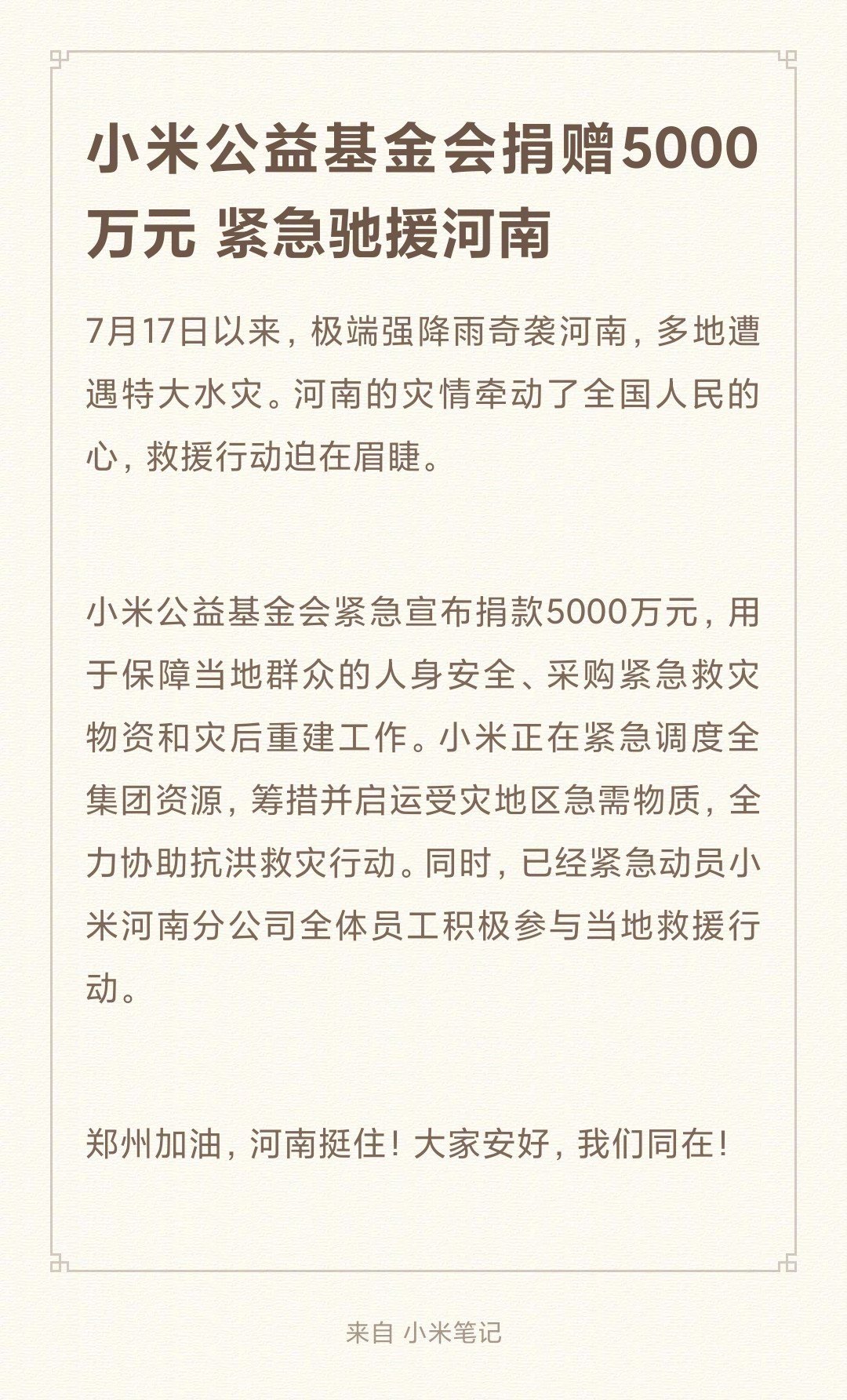 7月21日早间消息,小米公司董事长雷军在其个人微博发文称,小米公益基金会宣布捐赠5000万元,紧急驰援河南。