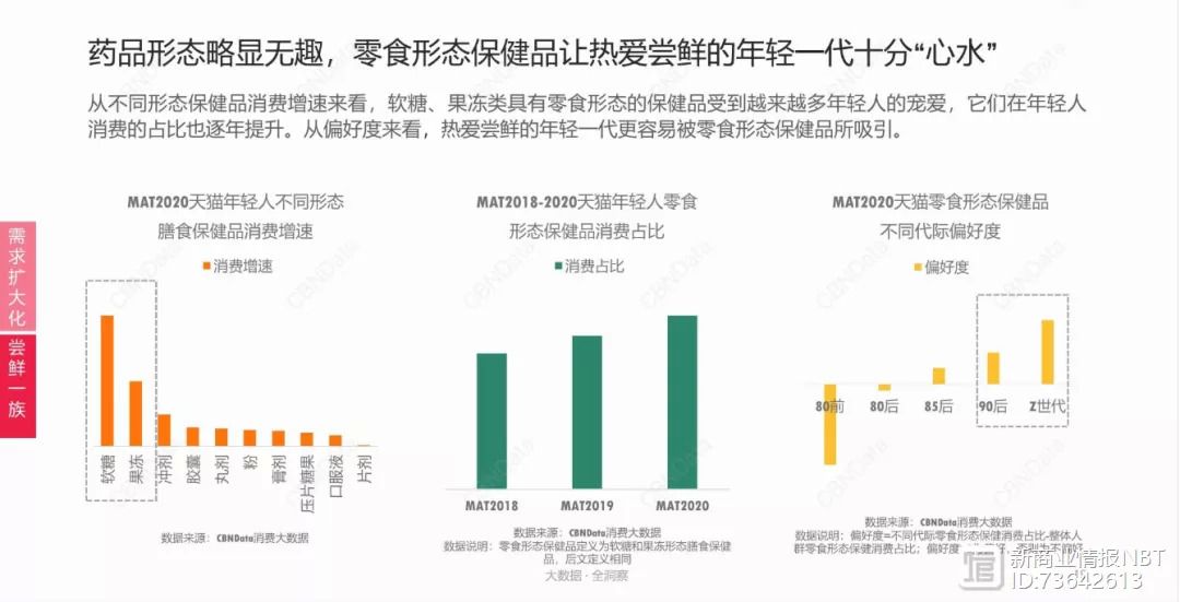 在众多功能性食品剂型中,软糖无疑成为最热门的一个。从天猫2020年的消费数据来看,软糖是年轻群体中消费增速最快的剂型,从全球市场来看也是如此。