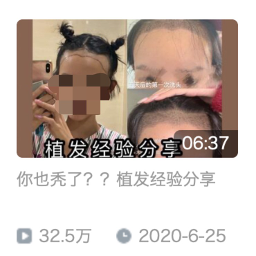 过去传统的植发广告主要投放在地铁站和路边,对于年轻的女孩子这种广告传递的依然略显“神秘而危险”,不少人认为毛囊有病变的人才会选择植发,从观念上与今天不可同日而语。因而过去的“秃头少女”们大多只敢浅尝辄止地“擦生姜”、尝试各种“脱发神器”。而如今,植发“亲历者”们以视频、文字、照片等方式记录自己植发手术和术后恢复的过程、效果。曾经因为神秘而造成的恐惧感也逐渐消失。