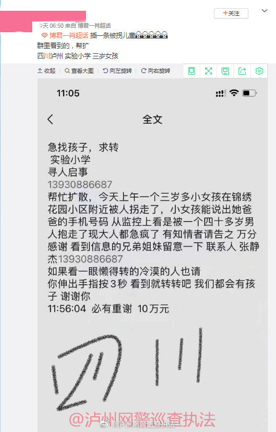 据四川@泸州网警巡查执法 消息,7月21日,网上流传一段信息:一个三岁多小女孩在锦绣花园小区附近被一个四十多岁男人抱走,请知情者联系张静杰,必有重谢。图中有“四川泸州”的文字。该消息引起泸州网友的大量转发。