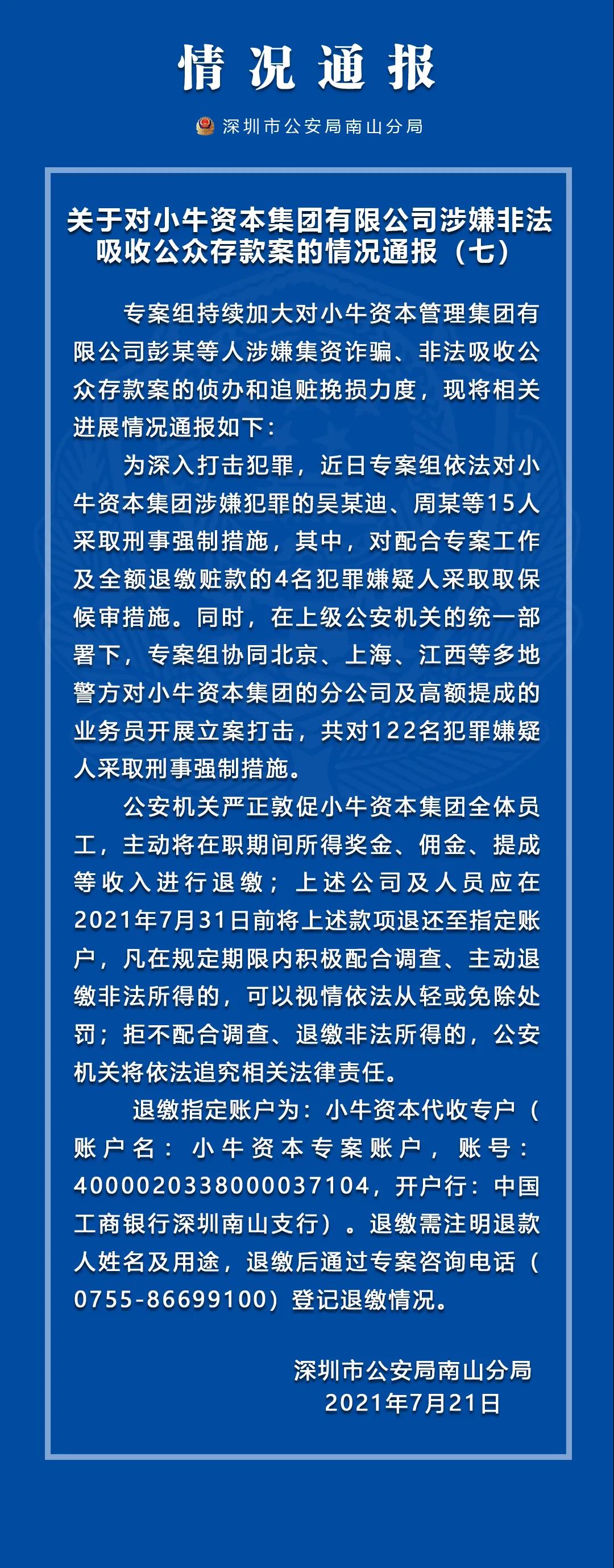7月21日,“深圳南山公安”微信公众号发布《关于对小牛资本集团有限公司涉嫌非法吸收公众存款案的情况通报(七)》。专案组依法对小牛资本集团涉嫌犯罪的吴某迪、周某等15人采取刑事强制措施。同时,专案组协同北京、上海、江西等多地警方对小牛资本集团的分公司及高额提成的业务员开展立案打击,共对122名犯罪嫌疑人采取刑事强制措施。