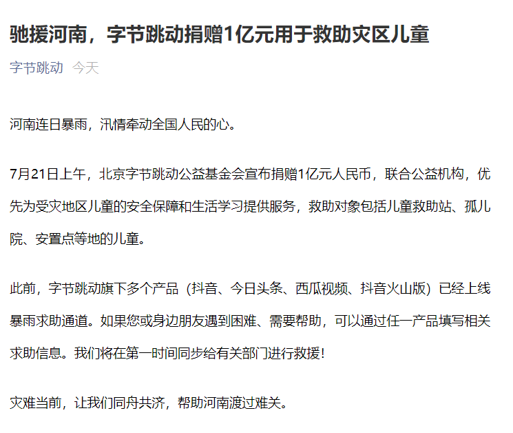 据“字节跳动”微信公众号消息,7月21日上午,北京字节跳动公益基金会宣布捐赠1亿元人民币,联合公益机构,优先为受灾地区儿童的安全保障和生活学习提供服务,救助对象包括儿童救助站、孤儿院、安置点等地的儿童。