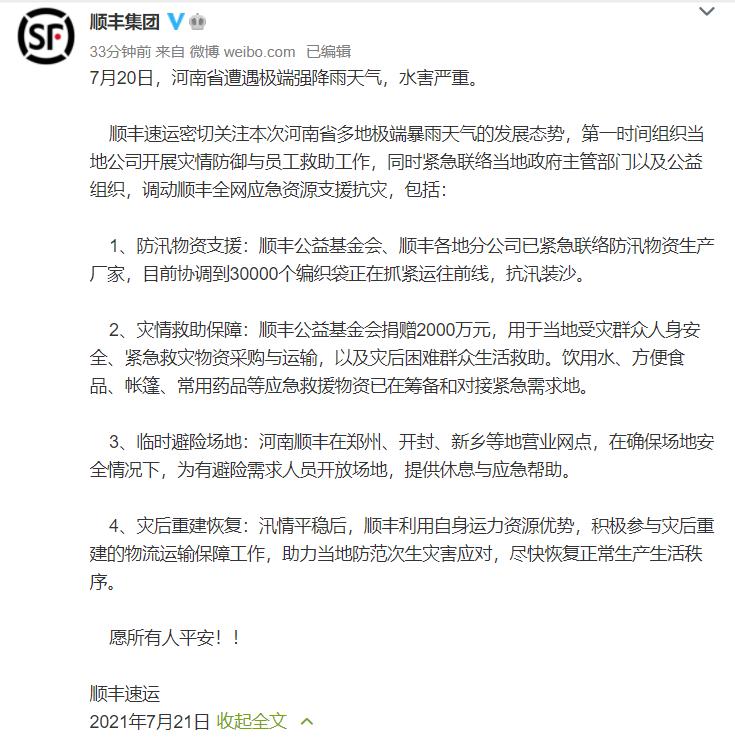 7月21日上午消息,据@顺丰集团 微博消息,顺丰公益基金会、顺丰各地分公司已紧急联络防汛物资生产厂家,目前协调到30000个编织袋正在抓紧运往前线。顺丰公益基金会捐赠2000万元,用于当地受灾群众人身安全、紧急救灾物资采购与运输,以及灾后困难群众生活救助。饮用水、方便食品、帐篷、常用药品等应急救援物资已在筹备和对接紧急需求地。