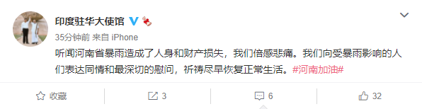 @印度驻华大使馆 微博7月21日发文称,听闻河南省暴雨造成了人身和财产损失,我们倍感悲痛。我们向受暴雨影响的人们表达同情和最深切的慰问,祈祷尽早恢复正常生活。