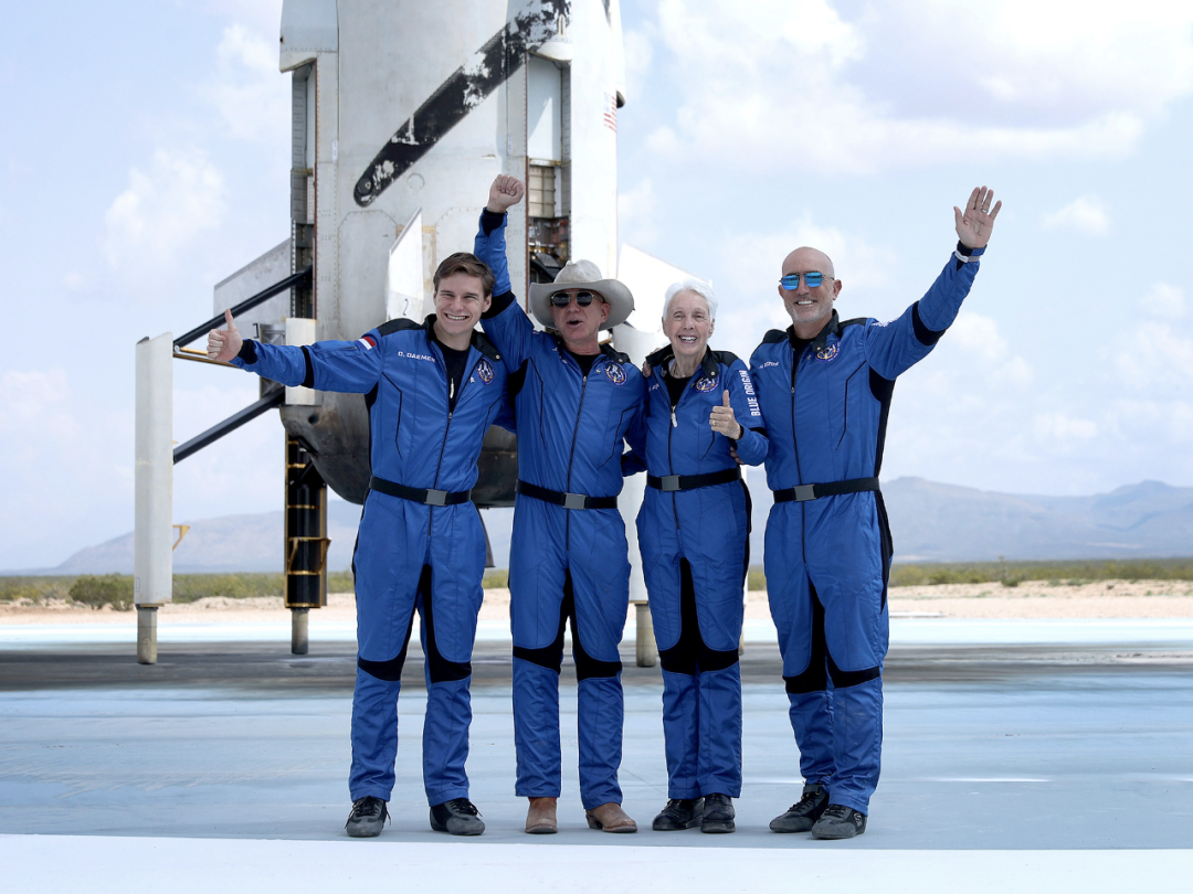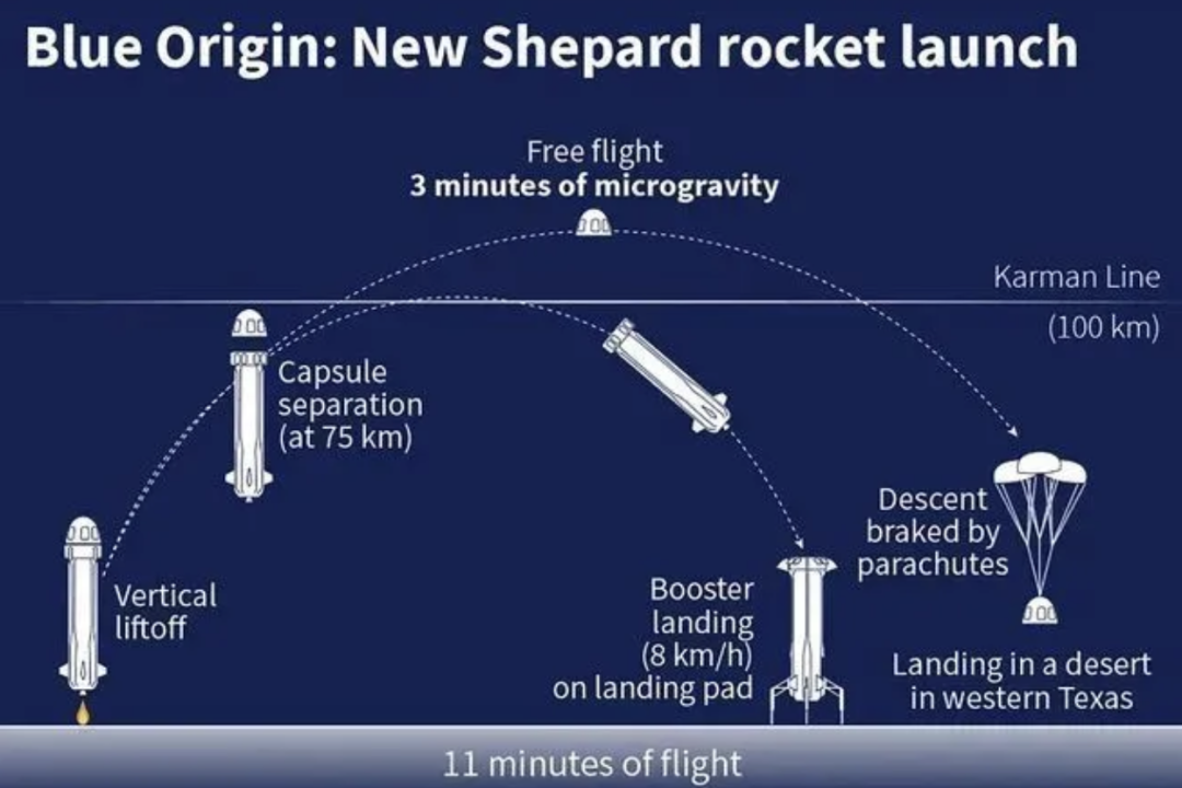 先乘火箭垂直起飞,成功飞越卡门线,体验了载人太空舱超过卡门线后的3分钟失重漂浮,最后依靠降落伞返回地球……尽管从飞船升空到返回全程只有10多分钟,但这已经足够秀出贝索斯的太空肌肉。