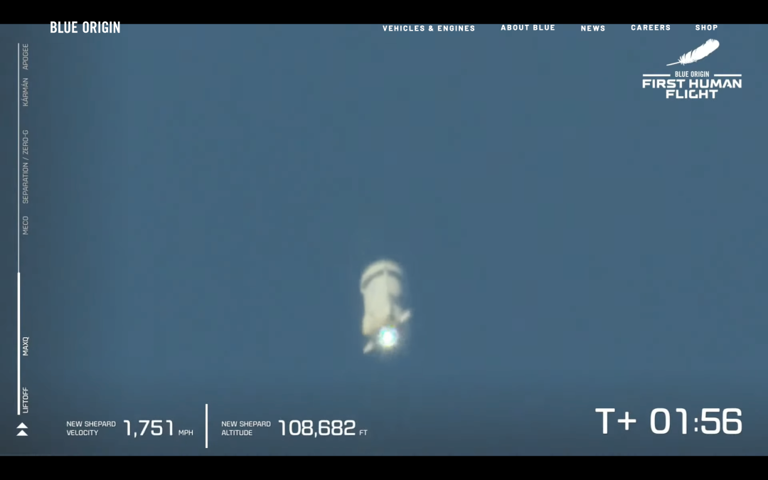 一切都按照计划成功地进行。美国东部时间7月20日上午9点,“新谢泼德”号在位于埃尔帕索东南部的西德克萨斯沙漠的发射架上垂直点火起飞,将顶端的载人舱推上高空,而后与载人舱分离,以反推方式垂直落回着陆场。