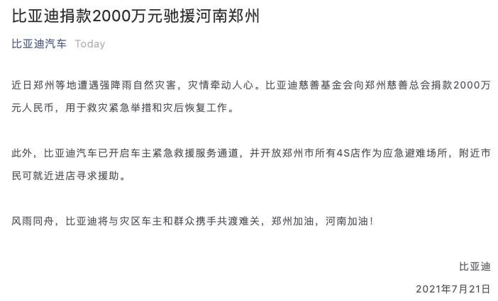 “比亚迪汽车”微信公众号7月21日消息,近日郑州等地遭遇强降雨自然灾害。比亚迪慈善基金会向郑州慈善总会捐款2000万元人民币,用于救灾紧急举措和灾后恢复工作。此外,比亚迪汽车已开启车主紧急救援服务通道,并开放郑州市所有4S店作为应急避难场所。