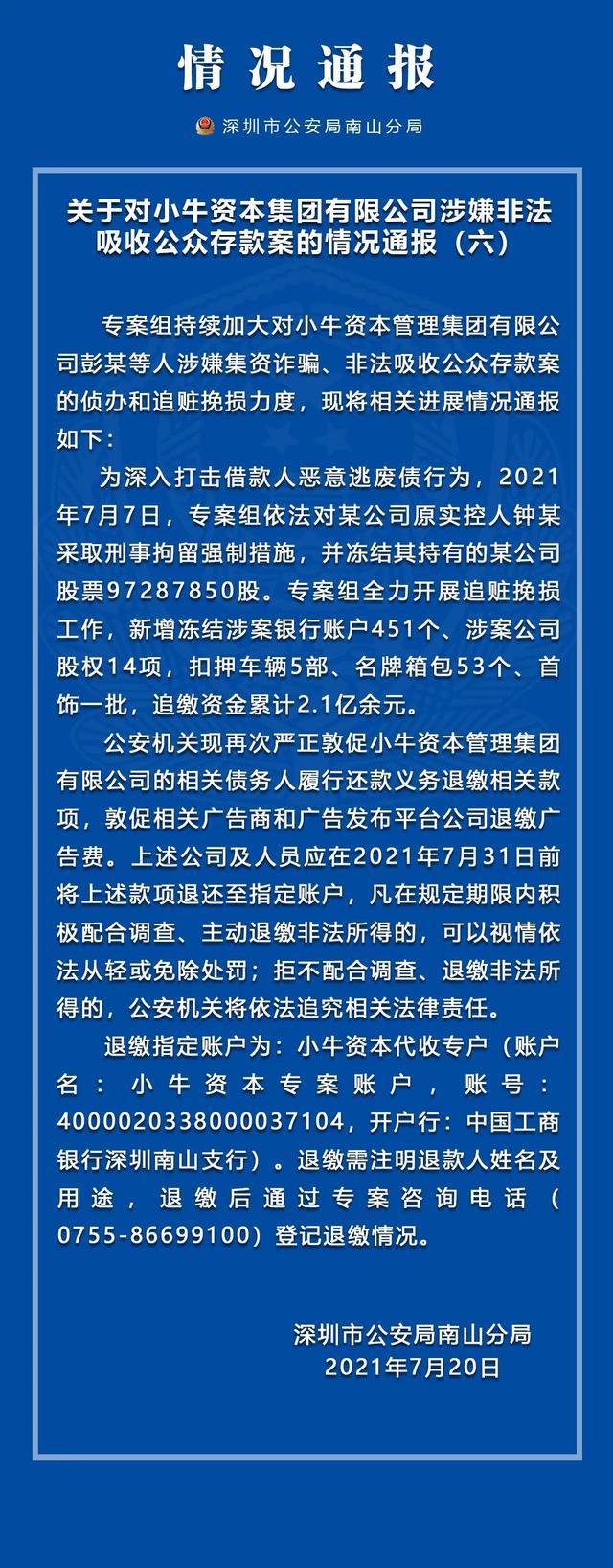 7月21日,深圳市公安局南山分局发布关于对小牛资本集团有限公司涉嫌非法吸收公众存款案第七份案情通报。