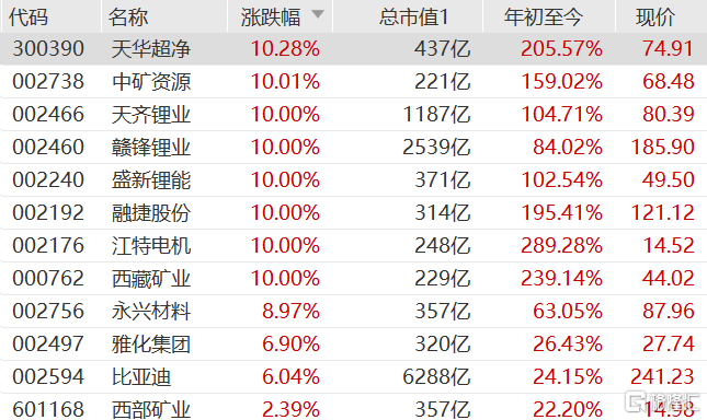 该指数下12家企业全线上涨,除创业板的天华超净(300390.SZ)涨10.28%之外,中矿资源(002738.SZ)、天齐锂业(002466.SZ)、赣锋锂业(002460.SZ)、盛新锂能(002240.SZ)、融捷股份(002192.SZ)、江特电机(002176.SZ)、西藏矿业(000762.SZ)这七家企业全部涨停。