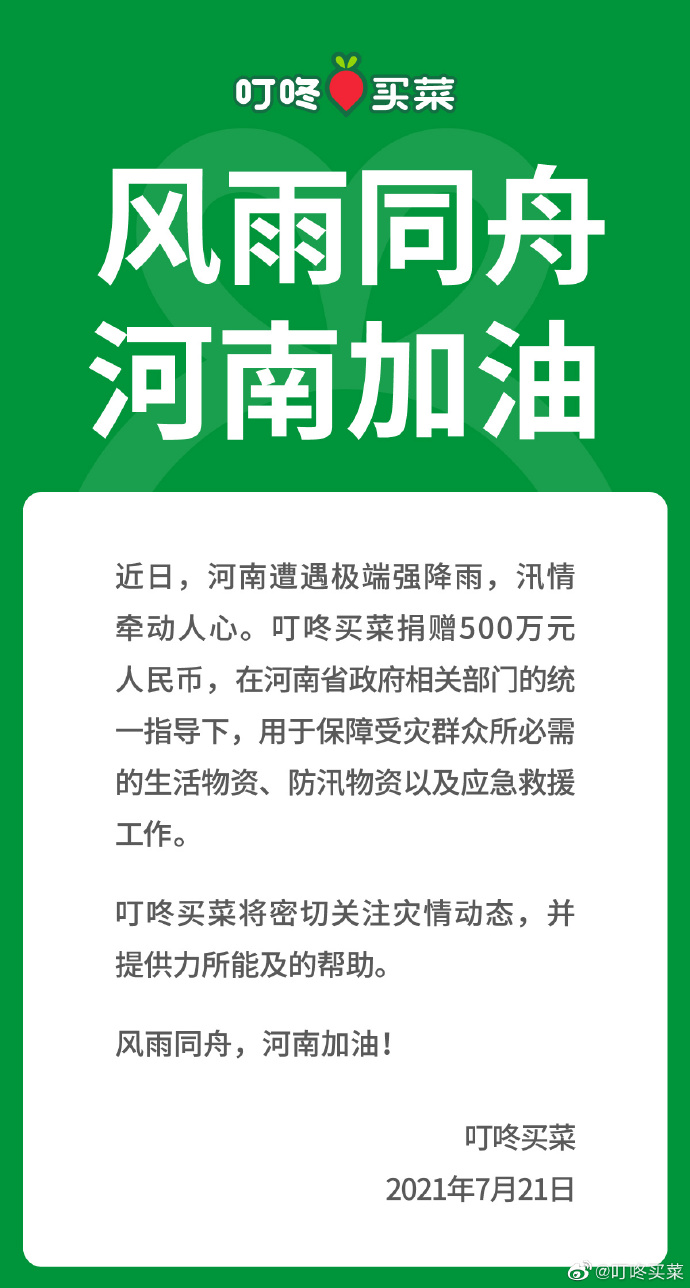 @叮咚买菜 微博7月21日消息,近日,河南遭遇极端强降雨。叮咚买菜捐赠500万元人民币,在河南省政府相关部门的统一指导下,用于保障受灾群众所必需的生活物资、防汛物资以及应急救援工作。