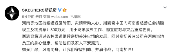 @SKECHERS斯凯奇 微博7月21日消息,河南等地区持续遭遇强降雨。斯凯奇中国向河南省慈善总会捐赠现金及物资总计300万元,用于防汛救灾工作、购置应对与灾后重建物资。
