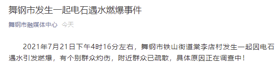 “舞钢市融媒体中心”微信公众号消息,2021年7月21日下午4时16分左右,舞钢市铁山街道棠李店村发生一起因电石遇水引发燃爆,有个别群众灼伤,附近群众已疏散,具体原因正在调查中!