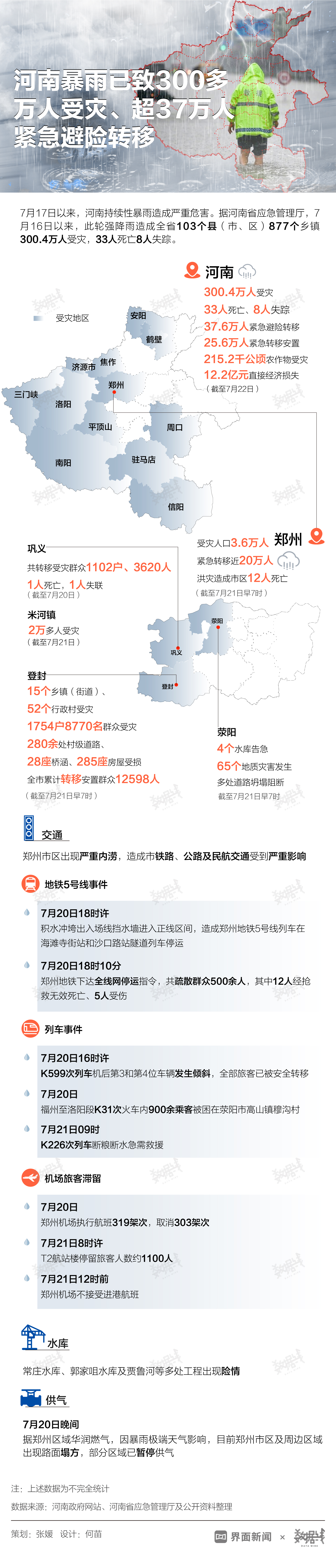 数据|河南暴雨已致300多万人受灾、超37万人紧急避险转移