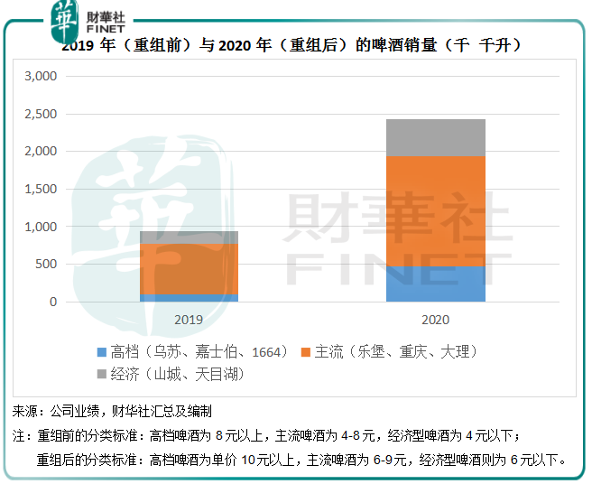重组前的高档啤酒为8元以上,主流啤酒为4-8元,经济型啤酒为4元以下。可见重组之后,其啤酒分类也提了档,原来的高档啤酒已降维至主流类别。