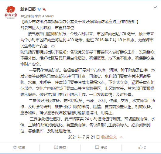 @新乡日报 微博7月21日消息,新乡市防汛抗旱指挥部办公室发布《关于做好强降雨防范应对工作的通知》指出,接气象部门监测和预报,今晚六时以来,市区降雨已达170毫米,预计未来两个小时市区降雨量将达到400毫米,超过2016年7月19日洪水。市防汛指挥部特发出以下通知:各级党员领导干部要深入做好群众工作,发动群众不要外出,组织社区居民开展自救活动,确保庭院、地下室不进水,确保群众生命财产安全。要严格落实24小时值班值守制度,密切监视雨情、水情、工情和灾情发展变化,有重要雨情,各级各部门主要领导人,必须到岗到位,靠前指挥,及时处理险情。