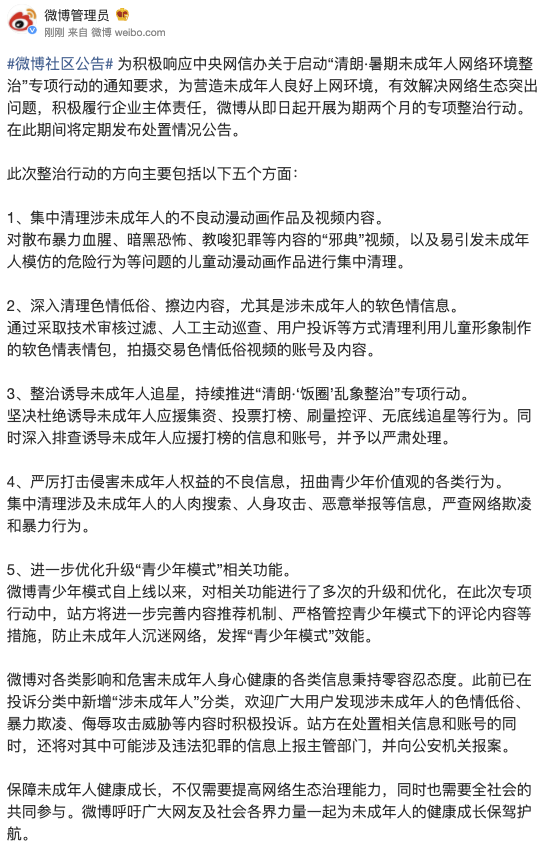 @微博管理员 微博7月21日消息,微博从即日起开展为期两个月的专项整治行动。此次整治行动的方向主要包括以下五个方面:集中清理涉未成年人的不良动漫动画作品及视频内容;深入清理色情低俗、擦边内容,尤其是涉未成年人的软色情信息;整治诱导未成年人追星,持续推进“清朗·‘饭圈’乱象整治”专项行动;严厉打击侵害未成年人权益的不良信息,扭曲青少年价值观的各类行为;进一步优化升级“青少年模式”相关功能。